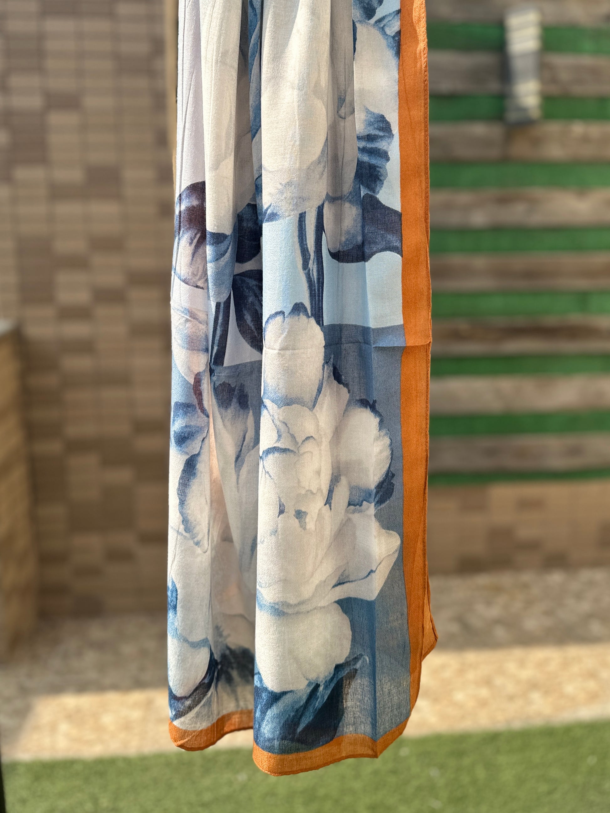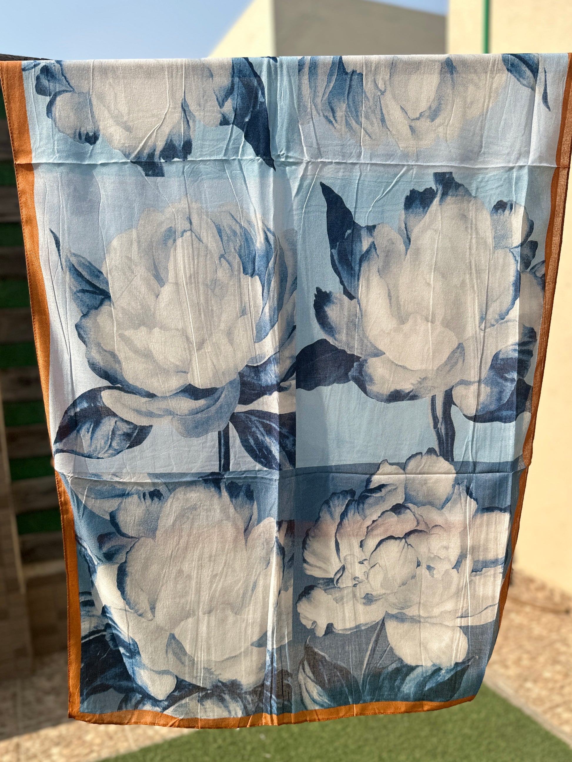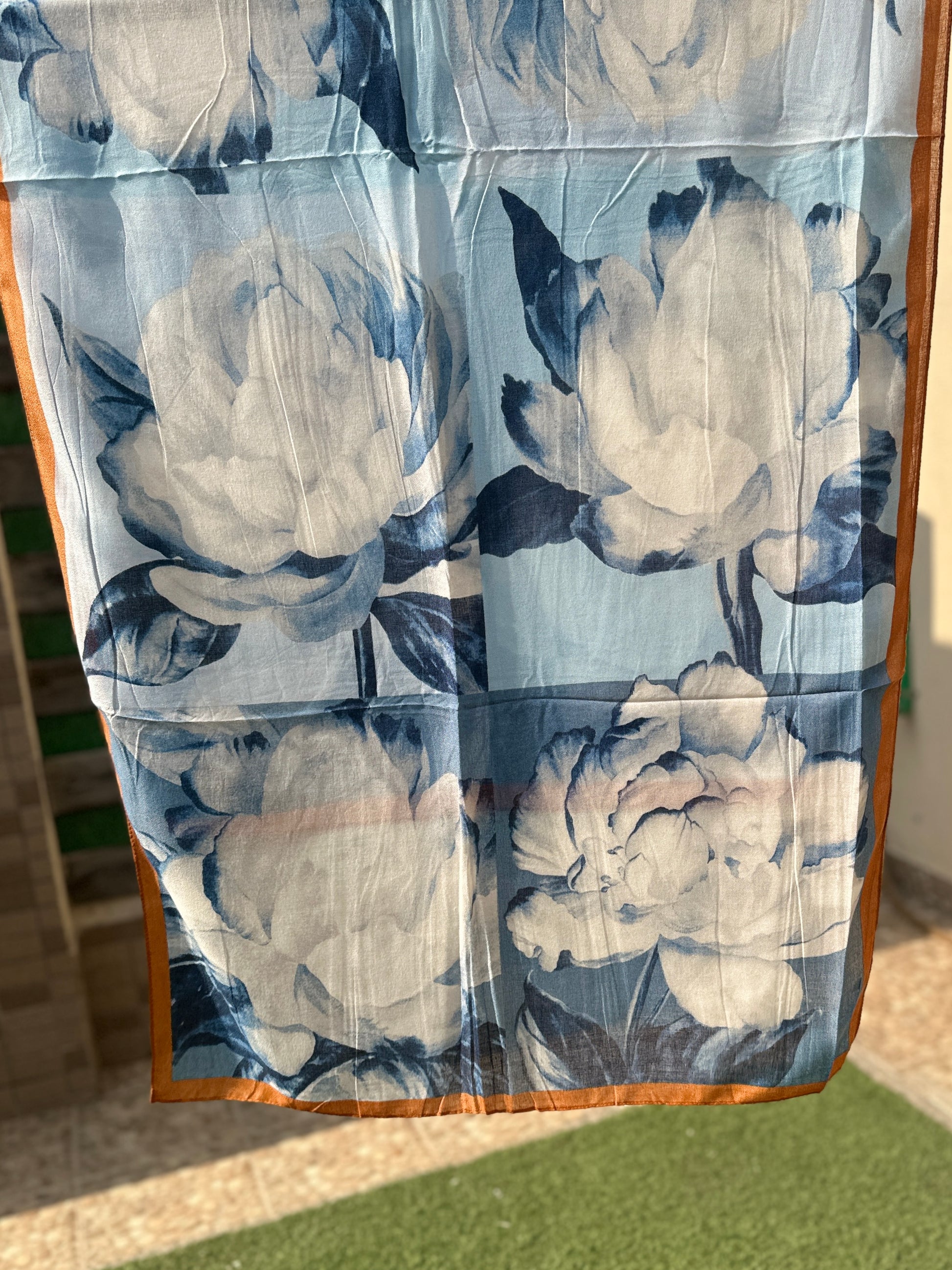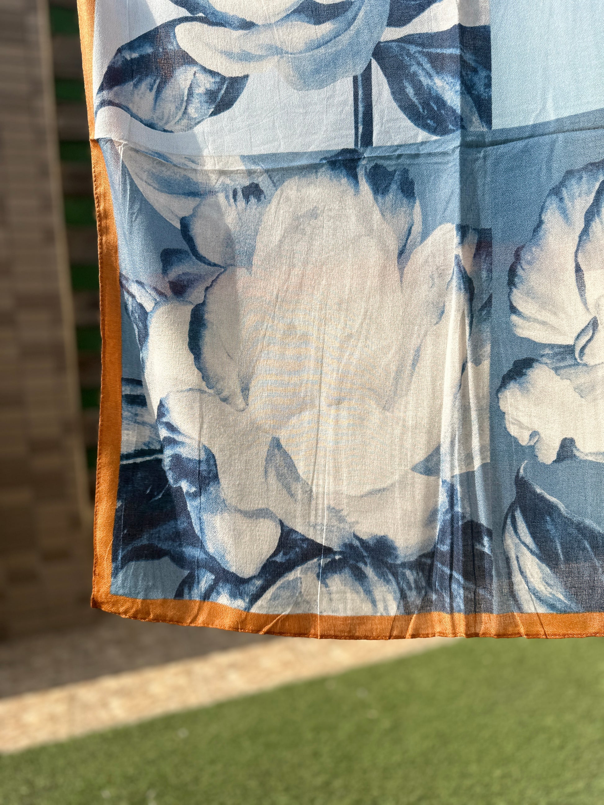 Oversized frosted floral motifs in cool blue tones blend seamlessly with a warm caramel border, creating a balanced and timeless design that elevates both casual and dressy looks.