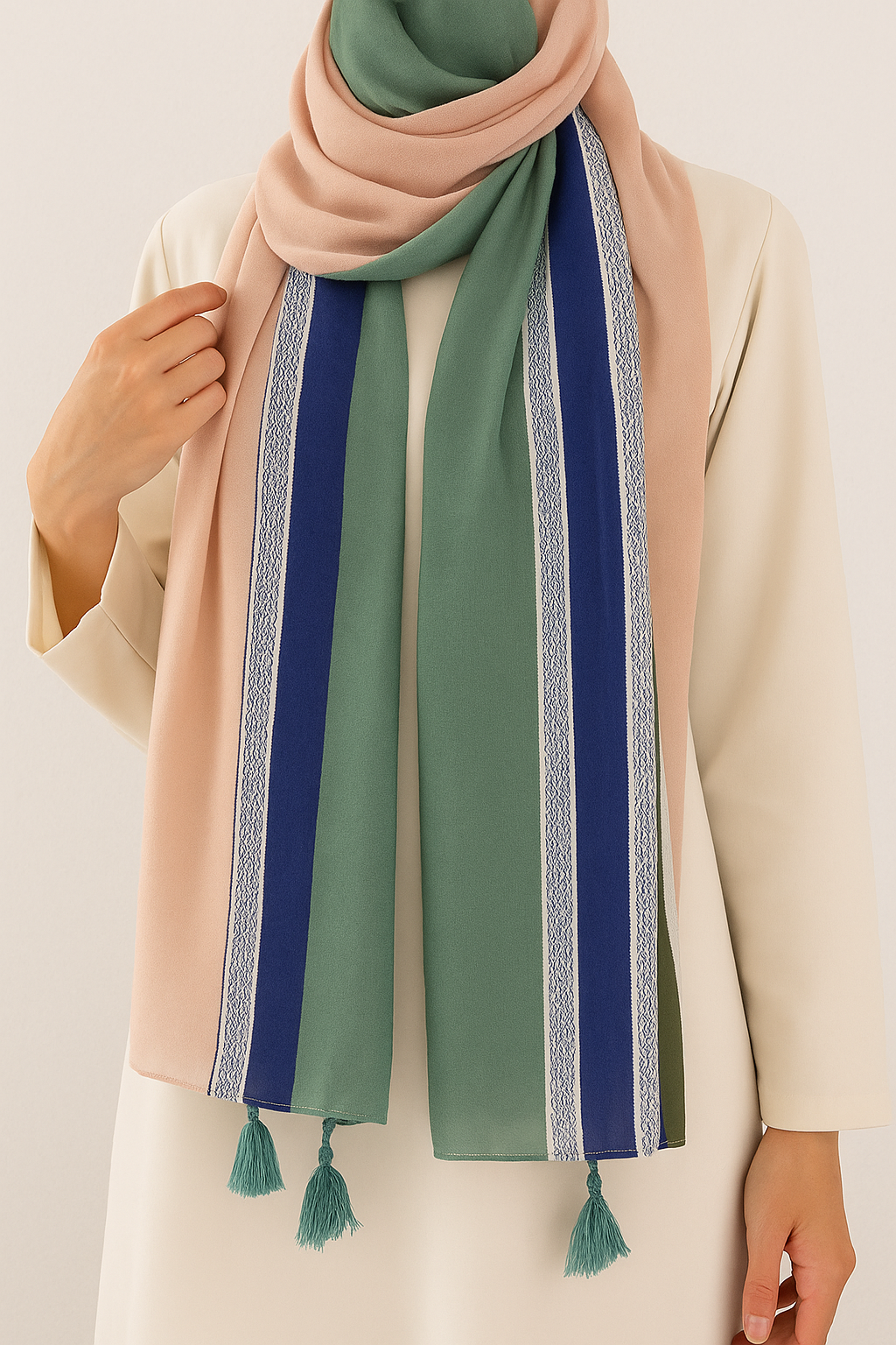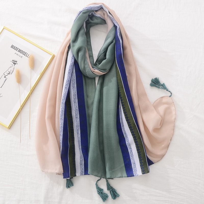 Multi-tone viscose hijab 180x90 cm – soft, breathable & lightweight with peach, green & navy stripes. Elegant tassel finish for everyday & occasions.